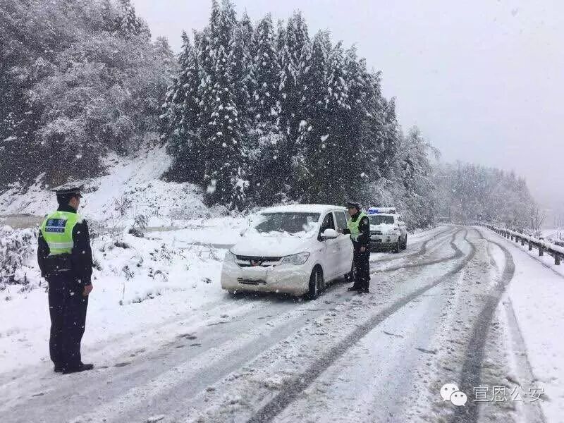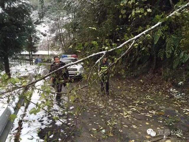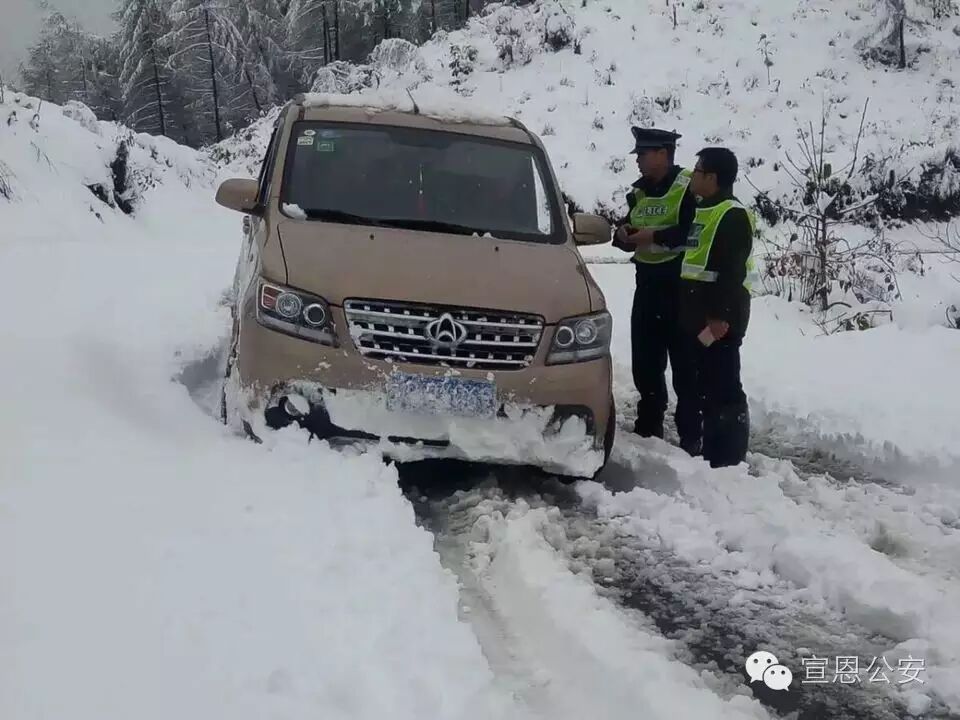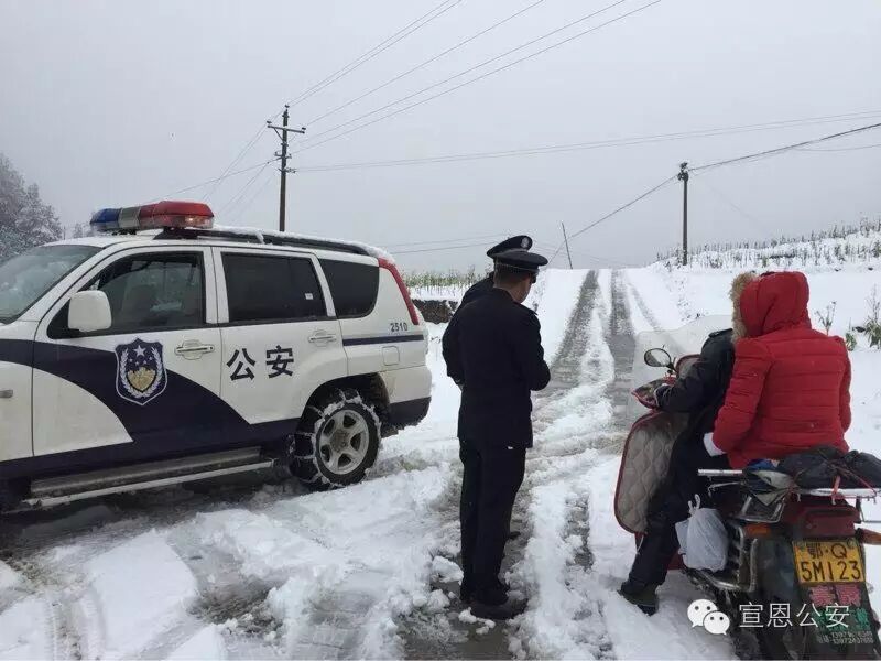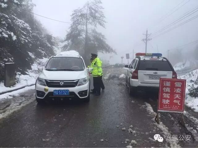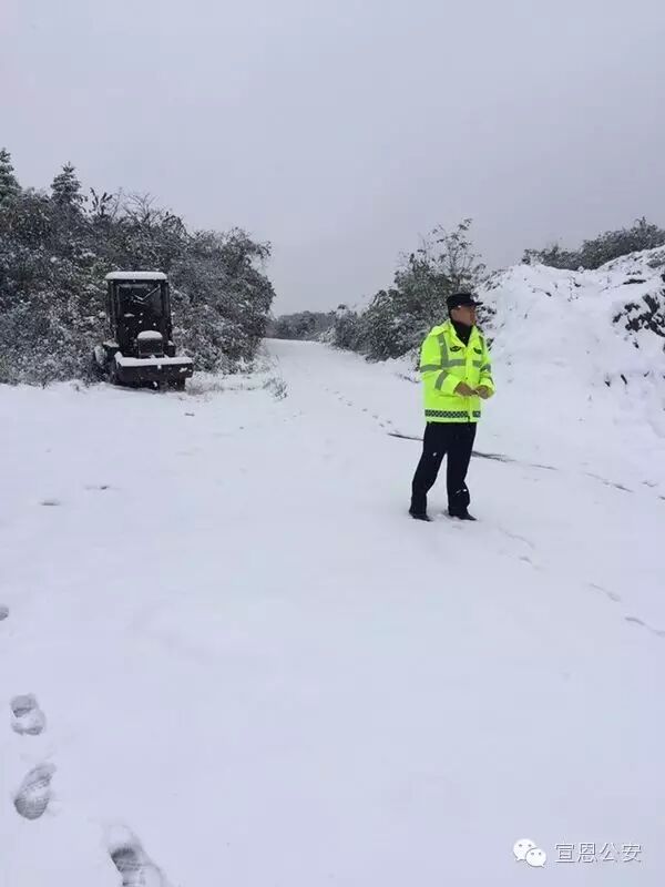 宣恩县迎来立冬后的首场降雪,地势较高的乡镇出现积雪,宣恩县公安局及各个派出所紧急启动恶劣天气应急预案,增加路面警力,在重要路段采取点查线巡方式,提醒过往车辆注意行车安全(如图椿木营派出所雪中执勤)。
